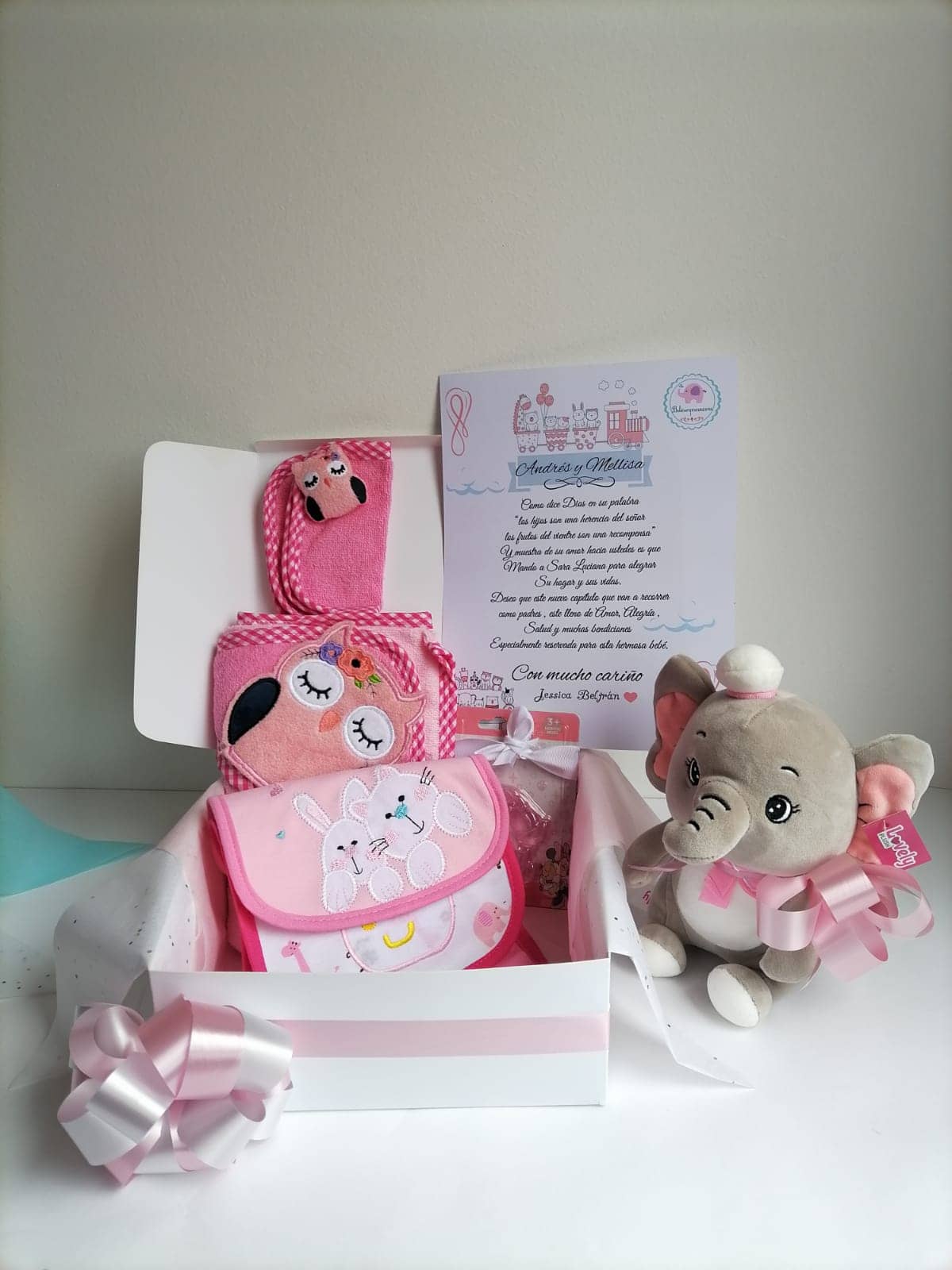 1 Caja de cartón Blanca decorada con el nombre del bebé